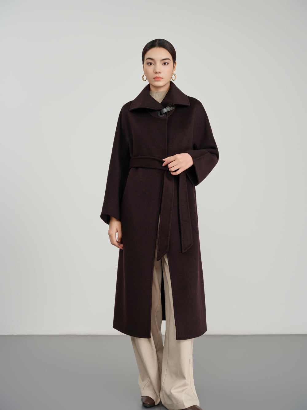Coat made of wool-cashmere. The collar of this coat can be a high collar or a lapel with long sleeves. Front patch pockets and a self-tie belt that defines the waist. Crafted from a soft wool-cashmere blend, it offers warmth with a luxurious feel.